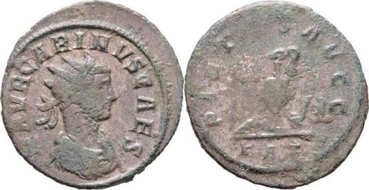 AE Antoninianus, Rv:"PIETAS.AVGG.", bohosluž. náčiní, podobný jako S.3353, RIC.157 - Řím - 6.dílna - blíže nedat., mírně exc., stopy původ. postříbření, patina