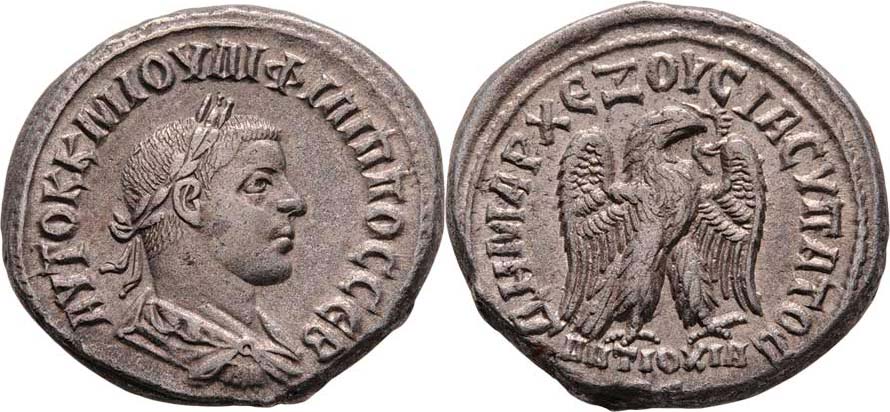 AR Tetradrachma, Rv: sedící orel, letopočet v opise, rok 4 (= 249), podobná jako SGI.4146, McA.1044a, Pri.474, 14.137g, oválný střížek, pěkná patina