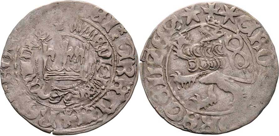 Pražský groš, Kut.Hora - Hanuš z Řásné, Há.XIII.e/5, zajímavý dvojráz (dvě koruny/ mnoho měsíčků), 2.648g, nedor., pěkná patina