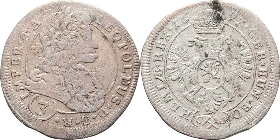 3 Krejcar 1697 CK, K.Hora-Krahe, Nech.316, MKČ.1460, 1.493g, škr., skvrnky, patina R!