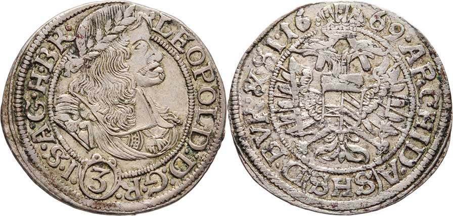 3 Krejcar 1669 SHS, Vratislav-Hammerschmidt, dělení opisů: ".D:G.R.(3).I.S.../...A.(SHS).D.BVR.&.SI." MKČ.1622, Nech.739, 1.815g, nep.exc., skvrnky, patina