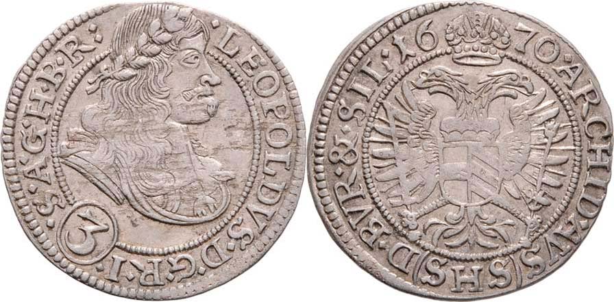3 Krejcar 1670 SHS, Vratislav-Hammerschmidt, dělení opisů: "LEOPOLDVS.D.G.R.I.(3)./.AVS.(SHS).D.BVR.&..", MKČ.1624, Nech.741, 1.686g, dr.vady mater., pat. RRR!