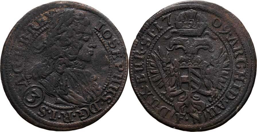3 Krejcar 1709 FN, Vratislav-Nowak, MKČ.1759, ČS.1088, 1.545g, nep.nedor., nep.zvlněný, tmavá pat.