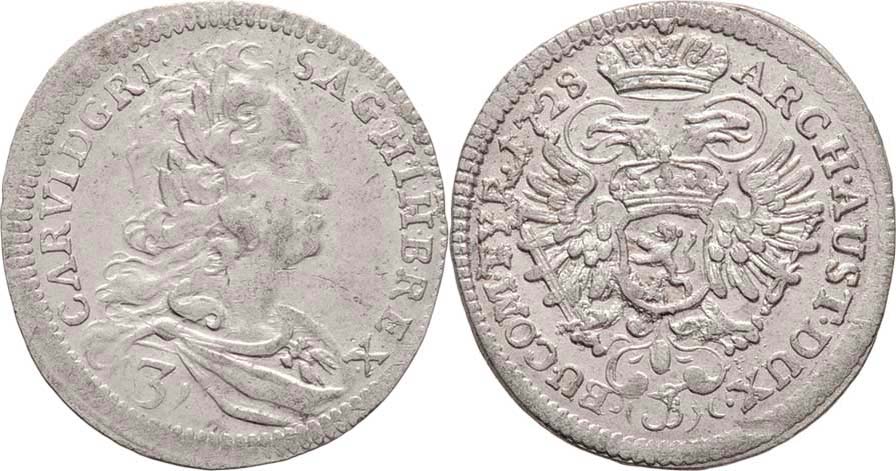 3 Krejcar 1728, Praha-Scharff, J.12a, MKČ.1839, 1.668g, mělká ražba, pěkná patina, téměř