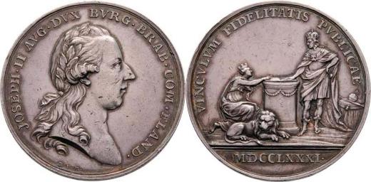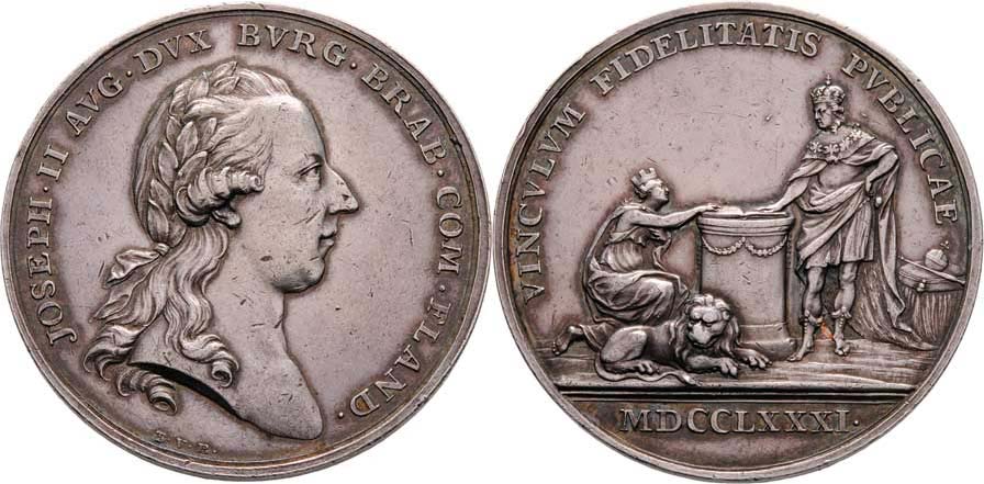 Berckel - AR 40mm na holdování ve Flandrech 1781 - poprsí zprava, opis / holdovací scéna, písmo, Sign., 25.755g, M.2139, H.3155, Nov.H.3b, dr.rysky, patina
