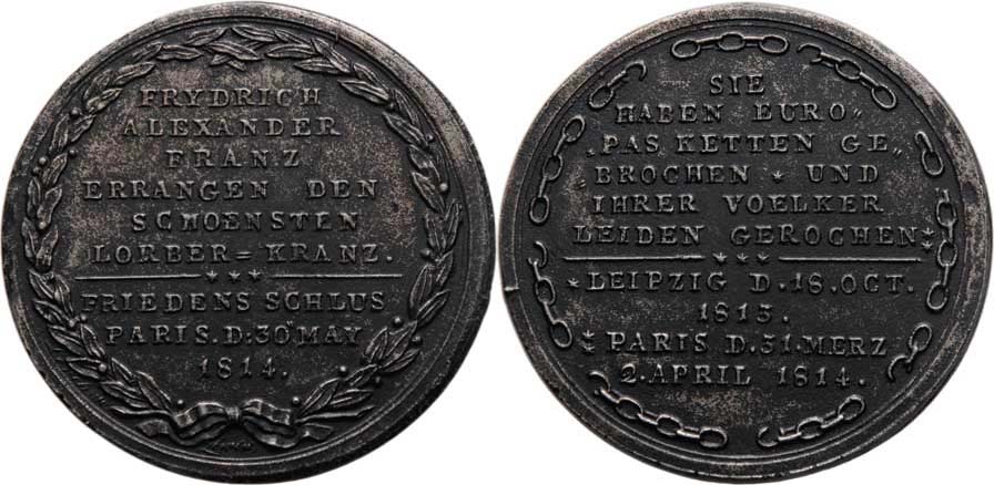 Lerch - německá medaile na obsazení Paříže 30.5.1814 - nápis ve vavřínovém věnci/ nápis uvnitř roztrhaného řetězu, Sign., patinované lité železo 53 mm