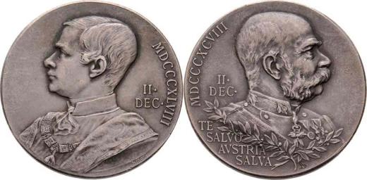 Scharff - medailka na 50 let vlády 1898 - poprsí zprava, nápis, vročení / mladé poprsí zleva, opis, vročení, Punc., Ag 26mm, 7.947g, ČS.1613, H.3883