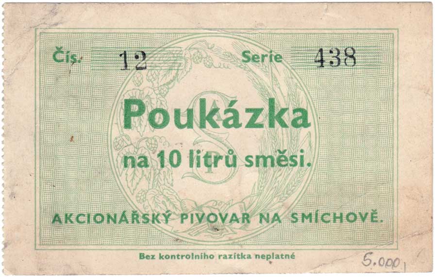Akcionářský pivorar na Smíchově - Poukázka na 10 litrů směsi, série 438, číslo 12 R!
