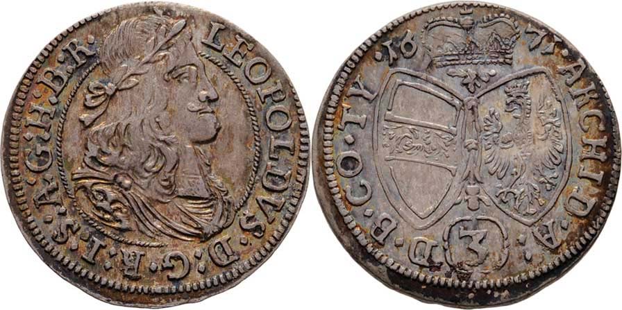 3 Krejcar 1671, Hall, Nech.2433, M-A.170, 1.635g, nep.exc., pěkná patina, téměř
