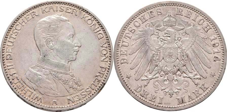 3 Marka 1914 A - císař v uniformě, Berlín, KM.538 (Ag900), 16.624g, dr.hr., dr.rysky, patina