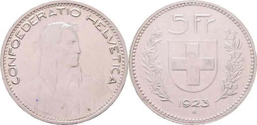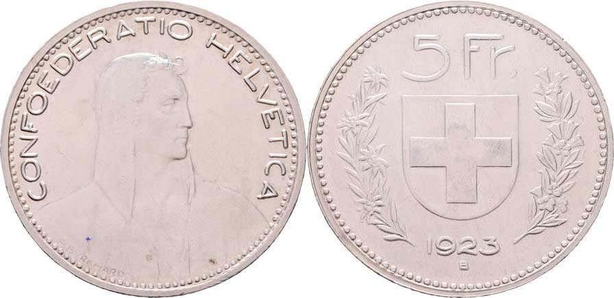 5 Frank 1923 B, Bern, KM.37 (Ag900), 24.976g, nep.hr., nep.rysky, téměř