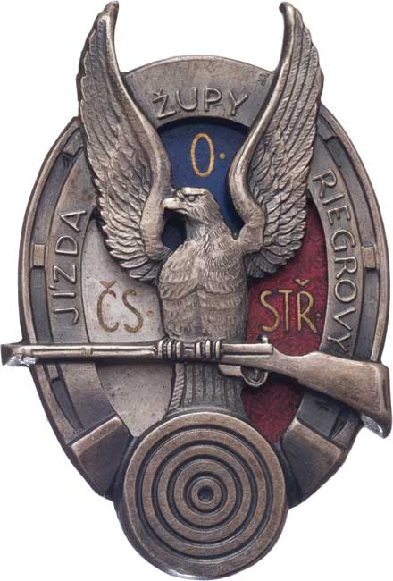 Čsl.obec střelecká a Jízda sokolské župy Riegrovy - střelecký odznak, Sign.Karnet-Kyselý-Praha, postříbř. a smaltovaný bronz 35x56 mm se zavír. špendlíkem RR!