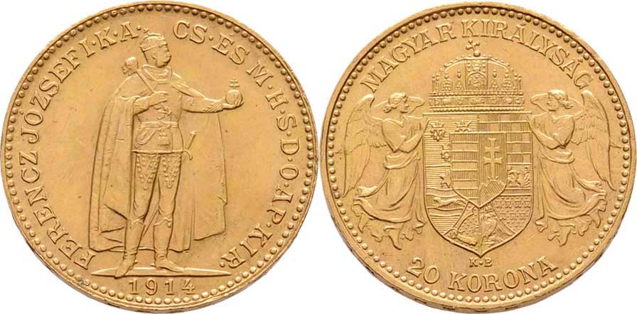 20 Koruna 1914 KB - se znakem Bosny - oficiální hybridní novoražba z roku 1946, Morav.159b (raženo pouze 18.940 ks), 6.764g, nep.hr., nep.rysky R!