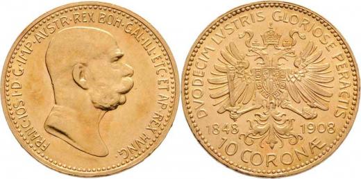 10 Koruna 1908 - jubilejní, 3.386g, pěkná patina