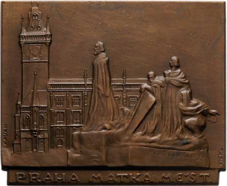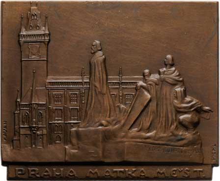 Praha - Matka měst b.l. - Husův pomník, Staroměstská radnice, nápis, Sign., razil Pichl, patinovaný jednostranný bronz 55x46 mm