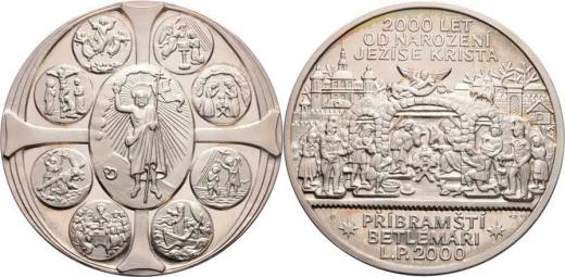 Příbramští betlémáři - 2000 let narození Krista 2000 - Betlém a 6-řádkový nápis/ velký kříž a devět výjevů z evangelia, Sign., Ag925, 70mm, 155.044g, 50ks, etue