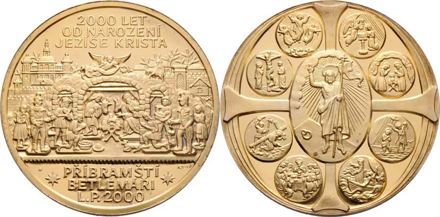Příbramští betlémáři - 2000 let narození Krista 2000 - Betlém a 6-řádkový nápis/ velký kříž a devět výjevů z evangelia, Sign., zlacený bronz 70 mm, 100ks RR!