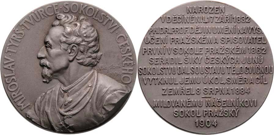 Miroslav Tyrš (1832 - 1884) - pamětní medaile 1904 - poprsí zleva, opis / 12-řádkový nápis, Sign., Nepunc. Ag(?), 34mm, 20.714g
