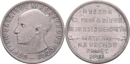 Ch.Garrigue Masaryková - hvězda čs. paní a dívek 1938 - portrét zleva, opis / hvězda, 7-řádk.nápis a lipové snítky, Sign., Ag987, 35mm, 14.936g, patina, téměř