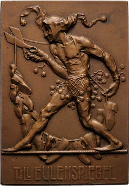 Eulenspiegel 1911 - pohádková postava, nápis, Sign., patinovaný jednostranný bronz 46x70 mm, 91.199g