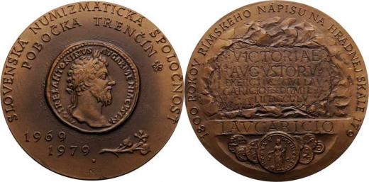 SNS Trenčín - 1800 let římského nápisu 1979 - replika mince Marca Aurelia, opis a nápis / nápis na skále, replika mince, písmo, Sign., pat.bronz 70 mm, Min.1b