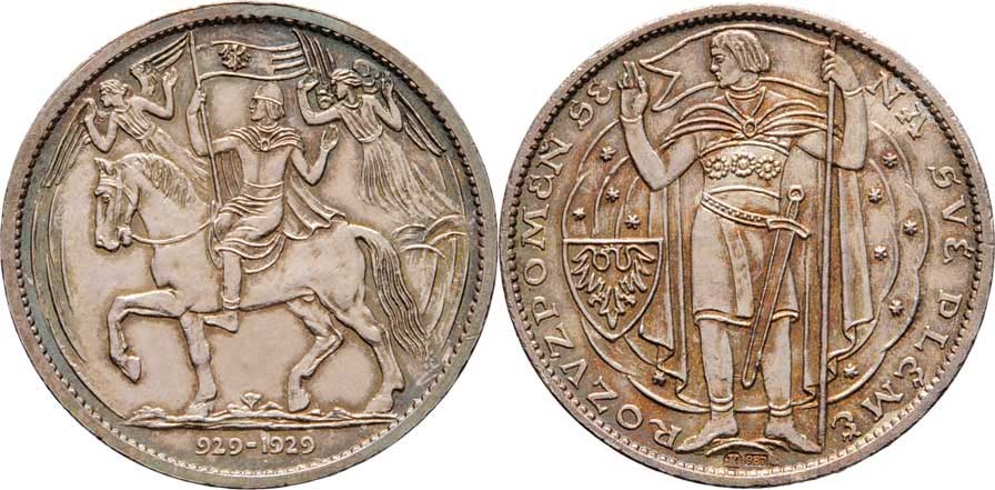 Menší medaile na milénium sv. Václava 1929 - svatý Václav na koni, andělé, vročení / svatý Václav, znak, opis, Punc., Ag987, 28mm, 14.968g, nep.hr., patina