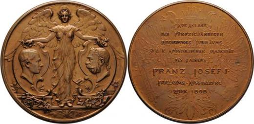 Vídeň - jubilejní výstava na 50 let vlády Fr.Josefa 1898 - Niké a dva portréty / znak překrytý 8-řádkovým nápisem, Sign., patinovaný bronz 63mm, 77.095g, téměř