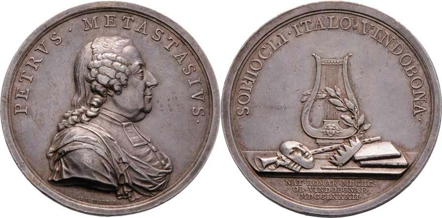 Petrus Metastasius - vídeňský hudebník 1698/1782 - poprsí zprava, opis / hudební a divadelní atributy, písmo, Sign., Ag 42mm, 26.194g,, nep.hr., dr.rysky R!