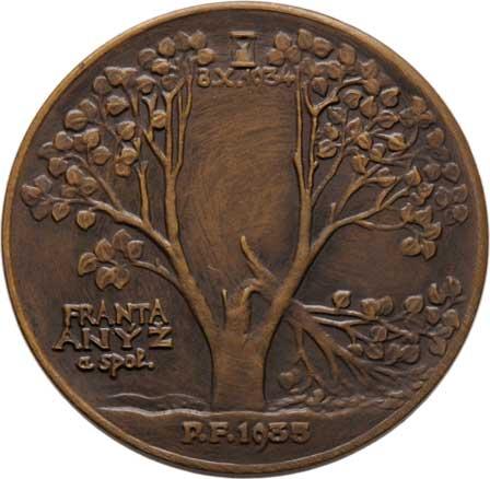 Uher Hugo - PF 1935 - lípa s jednou zlomenou a dvěma zdravými větvemi, přesýpací hodiny, datum 8.X.1934, Sign., jednostranný patinovaný bronz 50 mm, Kr.15