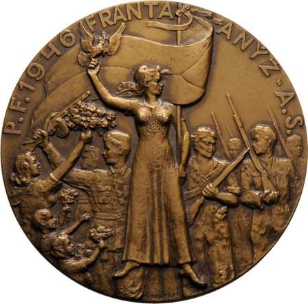 Beutler Miroslav - PF 1946 - osvobozená Republika nese prapor a sokola, za ní vojáci, partyzáni a děti, opis, patinovaný jednostranný bronz 60 mm, Kr.20