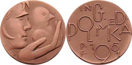 Flejšar a Špánek - PF 1961 - tvář zprava, ptáček na dlani / nesouměrný nápis, Nepunc., patinovaná měď, 24mm, 8.080g R!