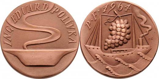 Bouda a Špánek - PF 1964 - talíř s polévkou, opis / loď na moři, hrozen révy, nápis, Sign.CB, patinovaná měď, 25mm, 8.083g R!