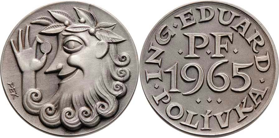 Pekárek a Špánek - PF 1965 - satyr s mincí / nápis a opis, Sign.PEK, Nepunc., patinované Ag, 24mm, 8.678g R!