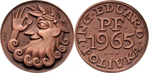Pekárek a Špánek - PF 1965 - satyr s mincí / nápis a opis, Sign.PEK, patinovaná měď, 24mm, 7.862g R!