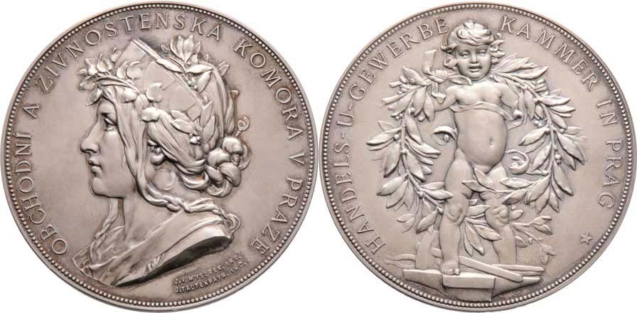 Myslbek - Obchodní a živnost. komora v Praze b.l. - hlava Čechie zleva, opis/ stoj. Putti s věncem, opis, Sign., Ag800, 56mm, 66.807g, ŠFP.8b, uděleno 33ks