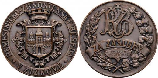 Řemeslnicko-živnostenská beseda - Za zásluhy 1931 - František Prostějovský - městský znak, opis / nápis ve věnci, Sign.Karnet-Kyselý, patin.postř.bronz 60 mm