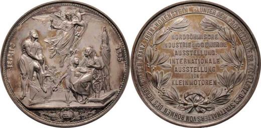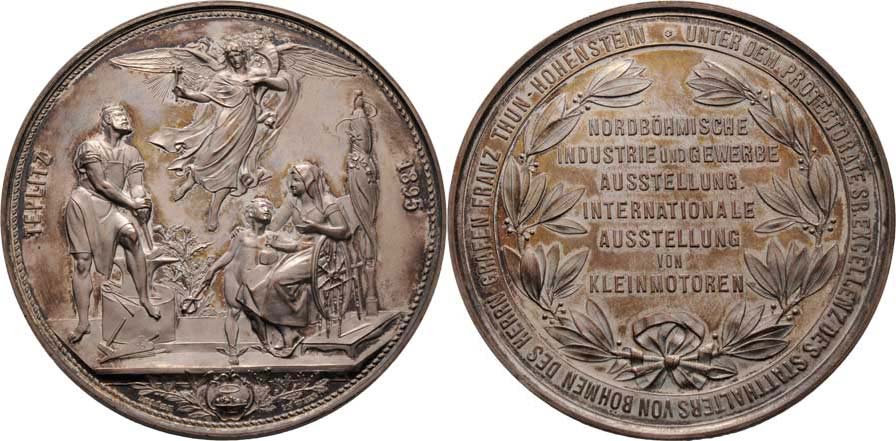 Leisek - Severočeská prům. a živn. výstava 1895 - alegorie, opis / 7-řádkový nápis ve vavřínovém věnci a opis, Sign., postř.bronz 60mm, vlas.rysky, pův.etue