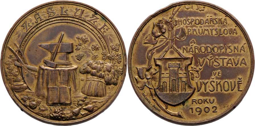 Šmakal - Hospodářská a národopisná výstava 1902 - znak, nápis, lipová ratolest / výstavní atributy, opis, Sign., Punc., zlacené Ag 43mm, 22.259g, hrany