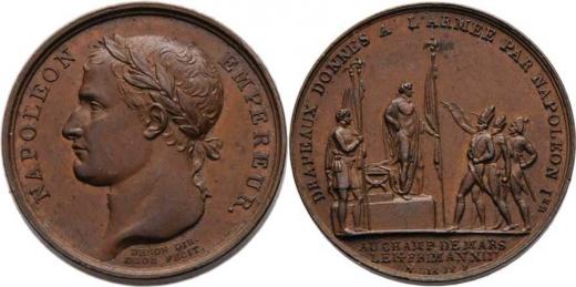 Denon a Droz - přidělení legionářských orlů 1804 - portrét zleva, opis / scéna přidělení orlů vojákům, písmo, Sign., měď 27mm, 10.253g, Zeitz.45, Jul.1294
