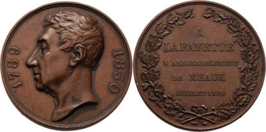 Generál Lafayette - obnovení Národní gardy 1789/1830 - poprsí zleva, vročení/ 5-řádkový nápis ve věnci, Sign.A.Gatteaux, měď 50 mm, dr.hr., nep.rysky, patina