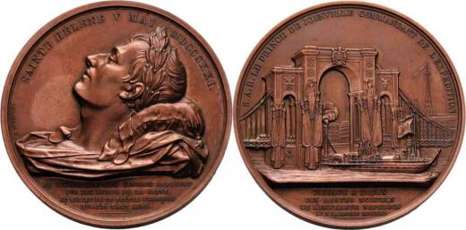 Napoleon I. - převezení ostatků do Francie 1840 - posmrtný portrét zleva, písmo / slavobrána a loď s ostatky, písmo, Sign.Depaulis, 63mm, znač."CUIVRE"