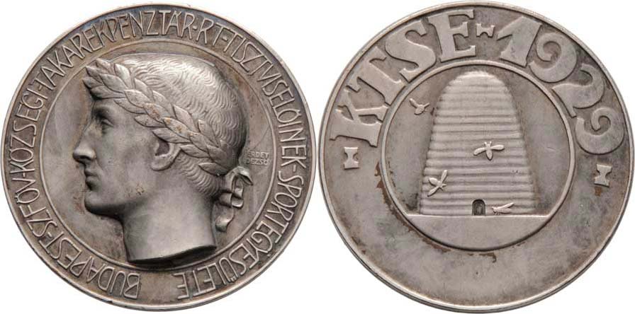 Erdey Deszo - zásl. medaile včelařského spolku 1929 - hlava zleva s vavřínovým věncem, opis / úl a opis, Sign., postříbřený bronz 35 mm, pěkná patina, téměř