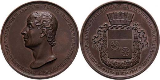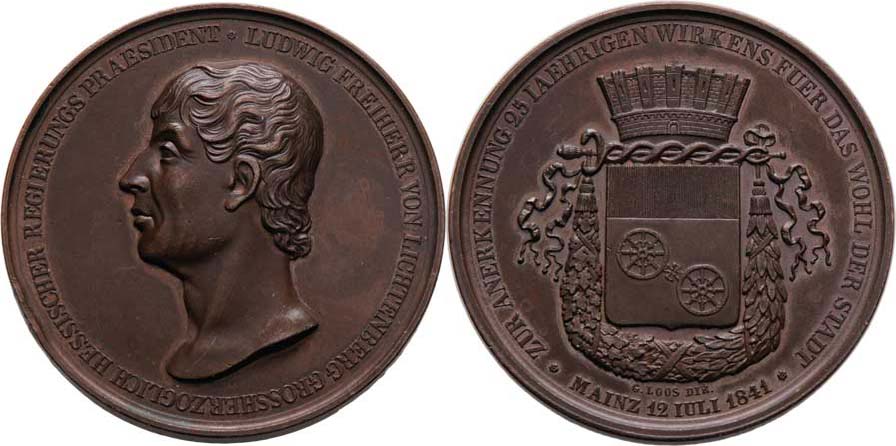 Poděkování města sv.pánu Ludwigovi von Lichtenberg za 25 let služby 1841 - poprsí zleva, opis / městský znak, opis, Sign.Loos, měď 48mm, dr.hr.,nep.rys.,tém.