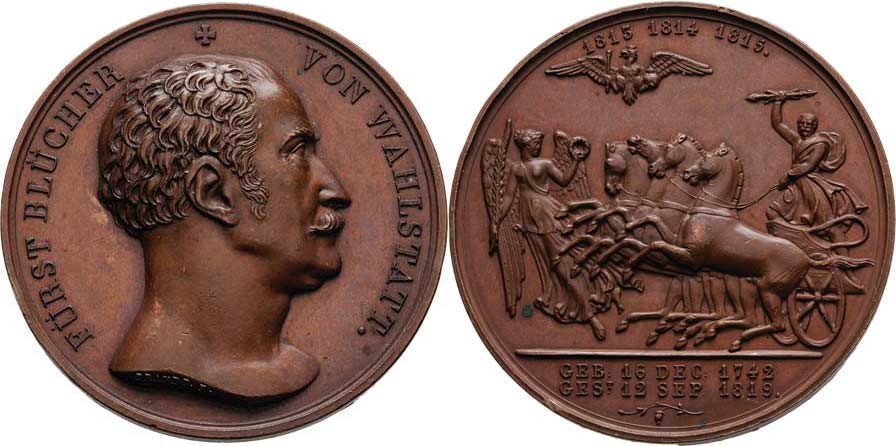 Maršál Blücher - úmrtní medaile 1819 - poprsí zprava, opis / vojevůdce na quadrize, Niké, orlice, písmo, Sign.Brandt, měď 41mm, 32.968g, dr.hr., patina, téměř