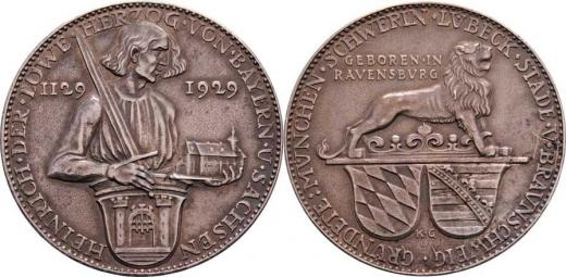 Götz - Jindřich Lev, vévoda bavorský a saský 1929 - poprsí s mečem a modelem kostela, znak, opis / lev se dvěma znaky, písmo, Sign., Ag999, 36mm, 19.792g, škr.