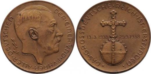 Hanisch - připojení Rakouska a Sudet k Říši 1938 - hlava A.Hitlera zprava, opis / říšské jablko, opis a nápis, Sign., patinovaný bronz 36mm, 18.524g, téměř