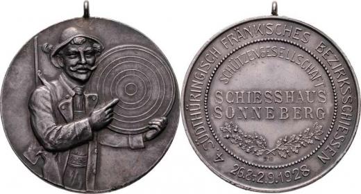 Sonneberg 1928 - 4.jihodurynské okrskové střelby - střelec s terčem / nápis, dubové ratolesti, opisy, Nesign., Ag990, 40mm, 22.779g, pův.ouško, hr., škr.