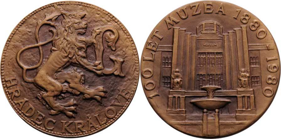 Hradec Králové - 100 let muzea 1980 - městský znak, opis / budova muzea, opis, Sign., patin.bronz 65 mm