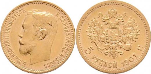 5 Rubl 1901 FZ, Petrohrad, Y.62 (Au900), 4.282g, hr., nep.rysky, pěkná patina