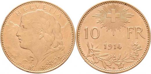 10 Frank 1914 B, Bern, KM.36 (Au900), 3.219g, nep.hr., nep.rysky, téměř